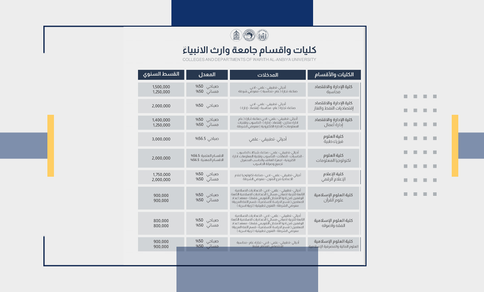 أعلنت جامعة وارث الأنبياء (عليه السلام) عن استعدادها لاستقبال طلبات التقديم للطلبة الناجحين في الدور الثالث للدراسة الإعدادية، بدءًا من الجمعة، 15 نوفمبر 2024.