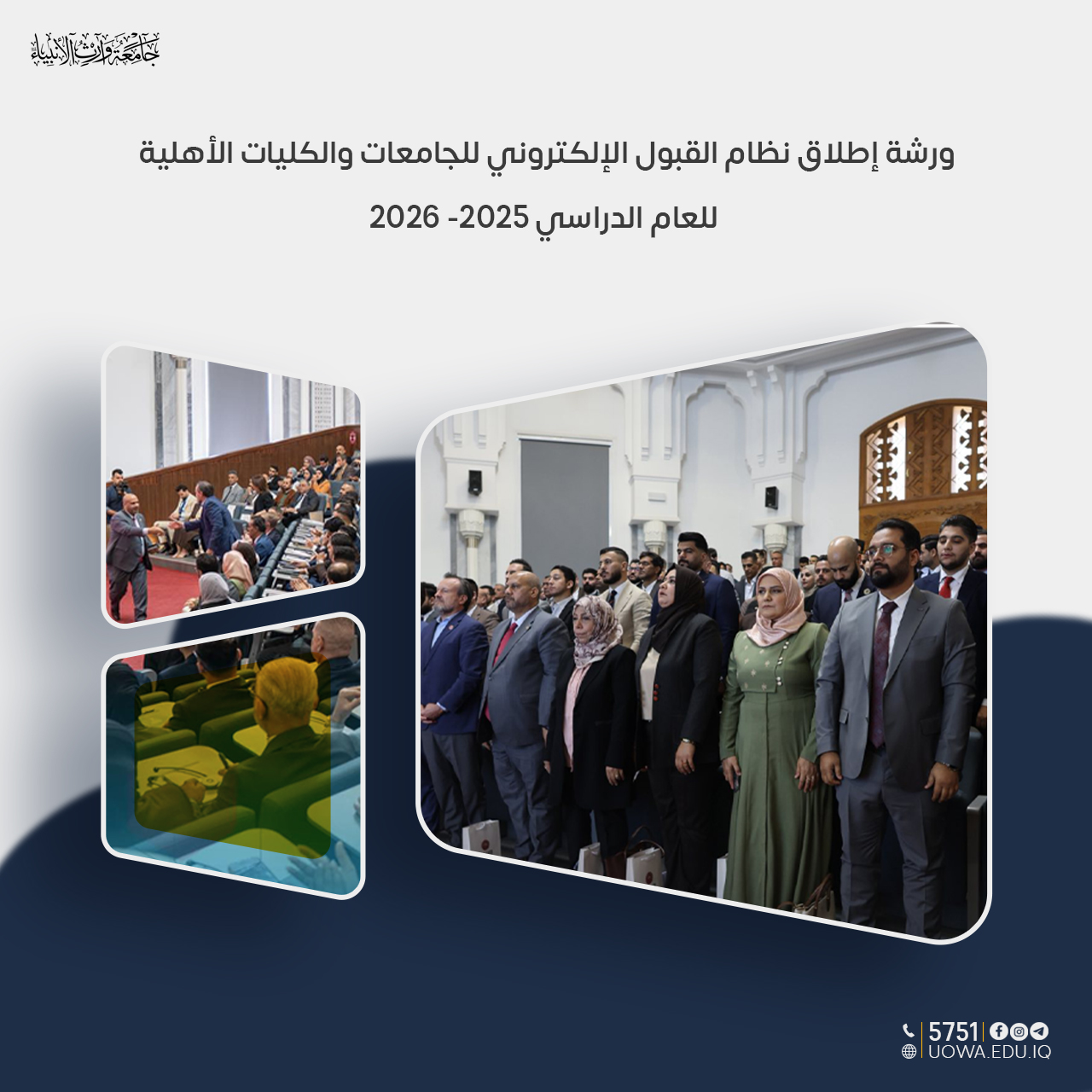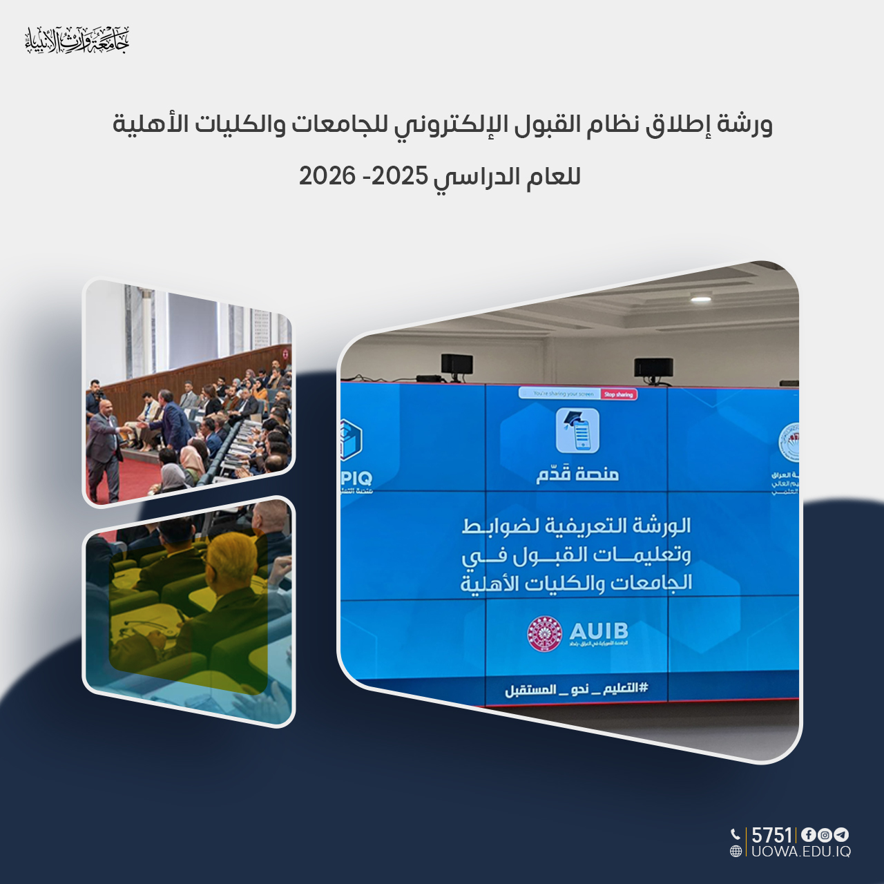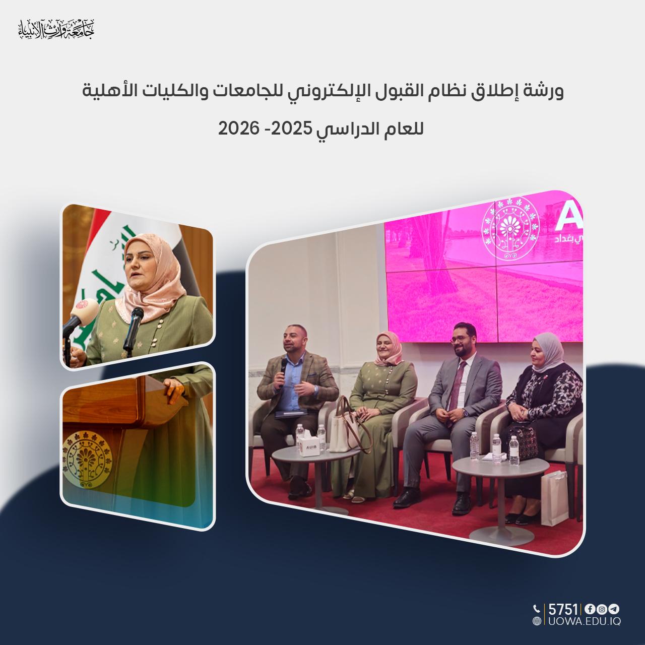 شارك رئيس قسم التسجيل والشؤون الطلابية السيد مؤيد سمير الخفاف وثلةٌ من موظفي القسم في الورشة التي أعدّتها وزارة التعليم العالي والبحث العلمي بشأن إطلاق نظام القبول الإلكتروني للجامعات والكليات الأهلية للعام الدراسي 2025-2026،