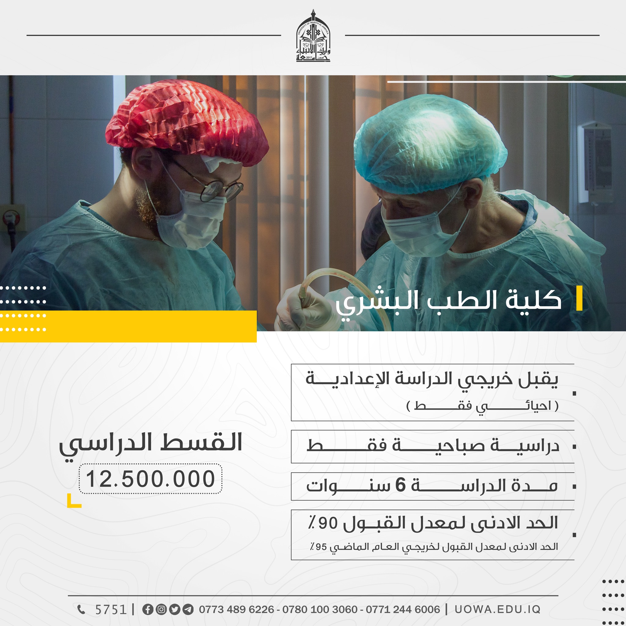 (عدا كلية الطب) اعزاءنا الطلبة الراغبين بالتسجيل في كليات واقسام جامعة وارث الانبياء(عليه السلام) (عدا كلية الطب) مراجعة الجامعة ابتداءً من السبت، إذ سيكون فريق التسجيل بانتظاركم من الساعة( ٨ ) صباحاً ولغاية( ٥ ) مساءً