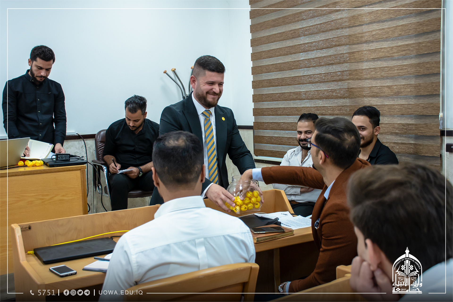 اقام قسم النشاطات الطلابية في جامعة وارث الانبياء(عليه السلام) اجتماعه الفني مع أعضاء لجان النشاطات الطلابية في الكليات وممثلي الطلبة المشاركين في البطولة في كليات واقسام الجامعة لاجراء قرعة بطولة وارث الانبياء السنوية لخماسي كرة القدم.