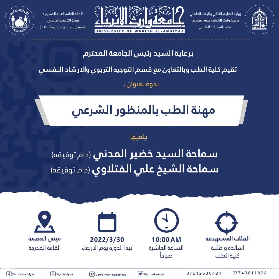 تقيم كلية الطب وبالتعاون مع قسم التوجيه التربوي والارشاد النفسي ندوة بعنوان " مهنة الطب بالمنظور الشرعي " يلقيها سماحة السيد خضير المدني وسماحة الشيخ علي الفتلاوي على القاعة المدرجة في مبنى العصمة داخل الجامعة.