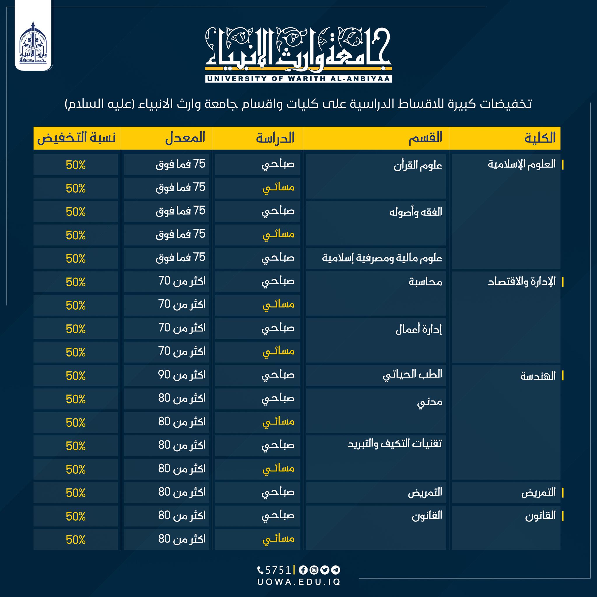 برعاية ودعم مبارك من المتولي الشرعي للعتبة الحسينية المقدسة ،سماحة الشيخ عبد المهدي الكربلائي ( دام عزه) جامعة وارث الانبياء(عليه السلام) تخفض الاجور الدراسية لكليات واقسام الجامعة وبنسبة 50% للإسهام في دعم المسيرة العلمية في بلدنا العزيز ولتحقيق طموح الطلبة الاعزاء بالدراسة الاكاديمية.