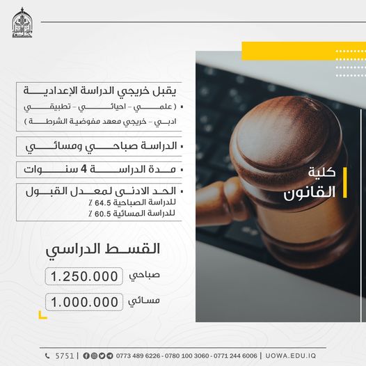 *حسب مباحثات الاجتماع التاسع لهيأة الرأي في وزارة التعليم العالي والبحث العلمي، تقرر منح مجالس الجامعات والكليات الأهلية صلاحية تخفيض معدلات القبول في كليات القانون في الدراسة المسائية الى (4 درجات) لغرض ملء الخطة، وعلية