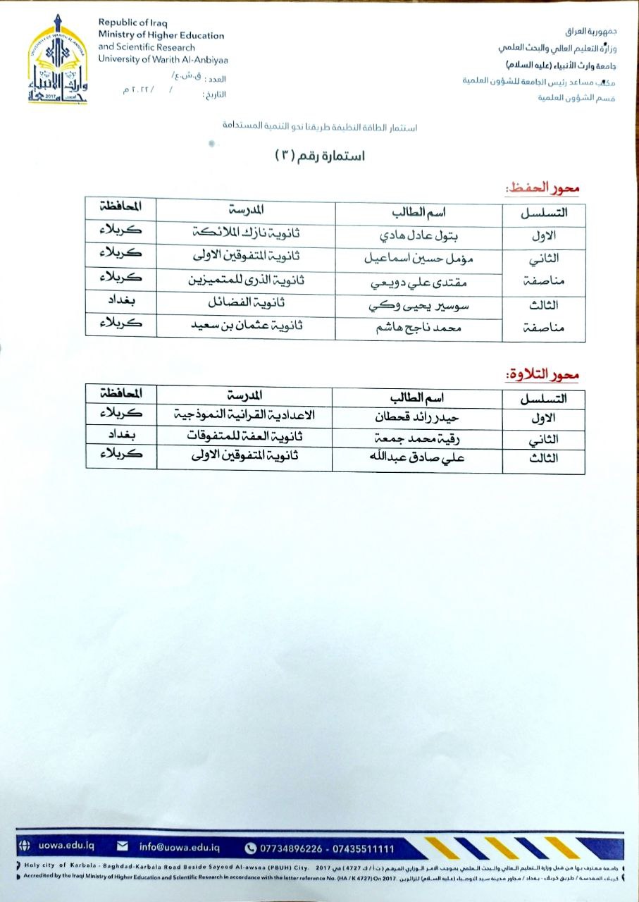 يسر جامعة وارث الانبياء (عليه السلام) أن تعلن عن أسماء الطلبة الفائزين بجائزة وارث الانبياء للمبدعين والموهوبين في المدارس الثانوية.