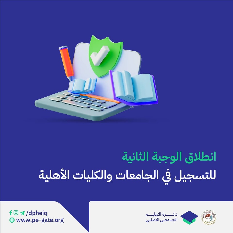 تعلن وزارة التعليم العالي والبحث العلمي إطلاق البوابة الثانية للتقديم للإلكتروني إلى الجامعات والكليات الأهلية للعام الدراسي 2023/2022.
