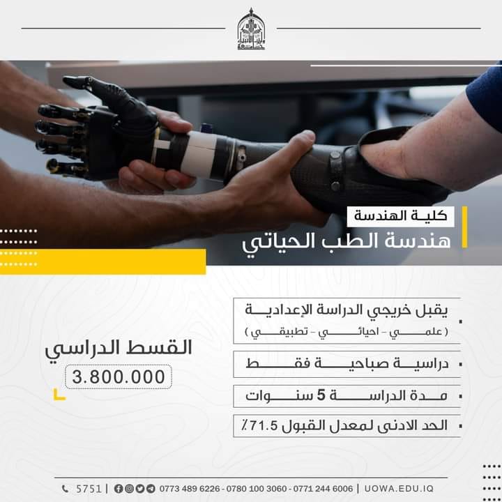 بشرى سارة لطلبتنا الاعزاء خريجي( الصناعة - اجهزه طبية) حصلت موافقة وزارة التعليم العالي والبحث العلمي على قبولكم في كلية الهندسة /قسم هندسة الطب الحياتي