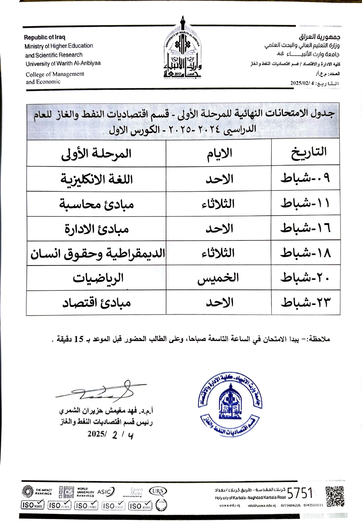 جدول الامتحانات النهائية للدراستين الصباحية والمسائية لقسم اقتصاديات النفط والغاز للعام الدراسي 2024-2025 الكورس الاول