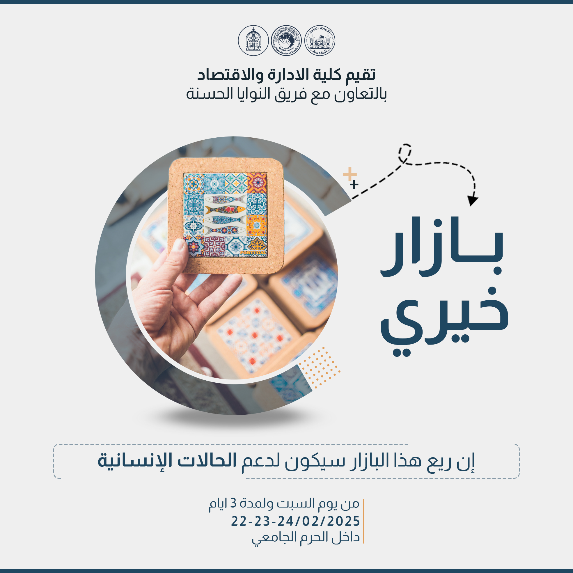 تقيم كلية الادارة والاقتصاد بالتعاون مع فريق النوايا الحسنة بازار خيري في جامعة وارث الانبياء (عليه السلام)/ داخل الحرم الجامعي ابتداء من تاريخ 22/2/2025 المصادف يوم السبت ولمدة ثلاثة أيام.