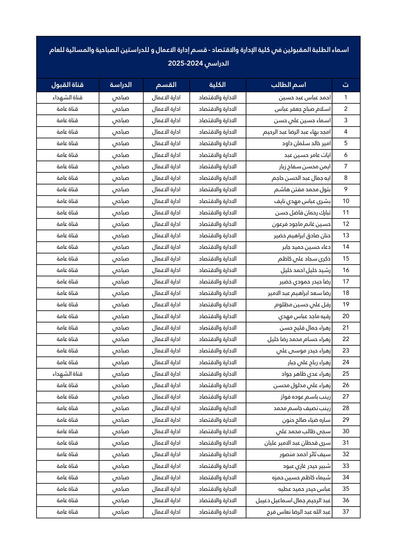 اسماء طلبة المرحلة الأولى قسم ادارة الاعمال 2024-2025