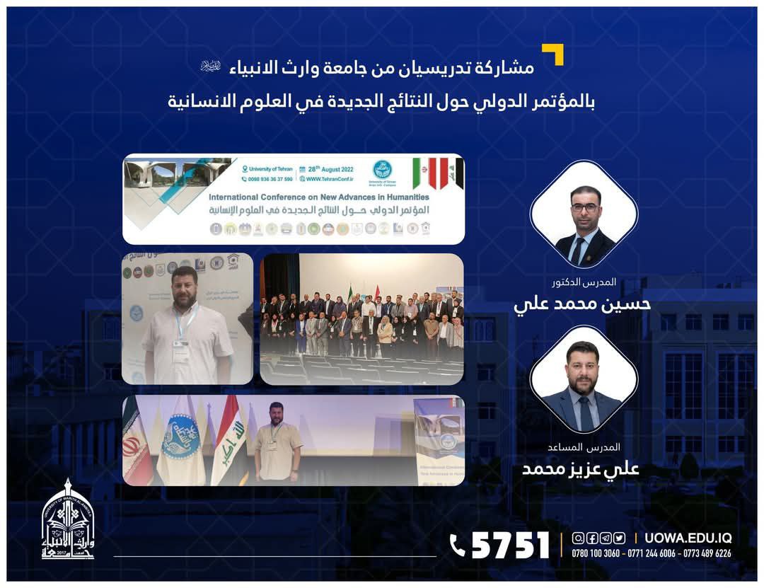 شارك التدريسيان في كلية الادارة والاقتصاد/قسم ادارة الاعمال، م.د حسين محمد علي ،و م.م. علي عزيز الكلكاوي في "المؤتمر الدولي حول النتائج الجديدة في العلوم الانسانية" الذي تقيمه جامعة طهران بمشاركة واسعة لعدد من الدول العربية والعالمية وجاءت المشاركة ببحث انساني مشترك بين التدريسيين حول النتائج الجديدة في العلوم الانسانية