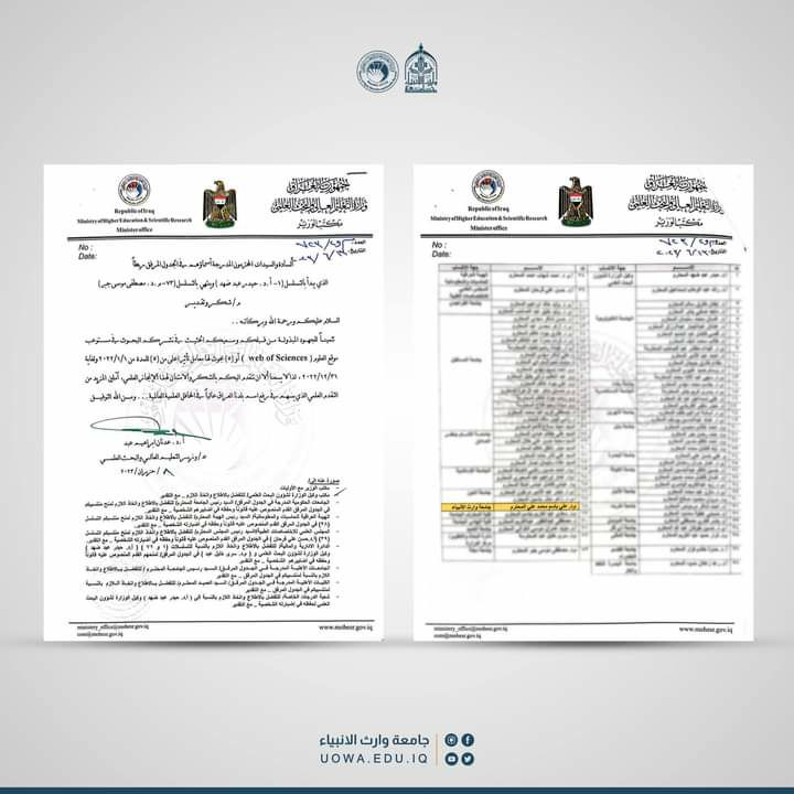 قدم وزير التعليم العالي والبحث العلمي " كتاب شكر وتقدير" للباحثين المتميزين لجهودهم القيمة وسعيهم الحثيث في نشر البحوث العلمية في مستوعب موقع العلوم(Web OF Sciences) ضمن بحوث لها معامل تأثير اعلى من (5) ومن ضمنهم رئيس قسم هندسة تقنيات التكييف والتبريد في جامعة وارث الانبياء(عليه السلام)، المدرس الدكتور علي باسم.وجاء هذا التكريم تثميناً لهذه الجهود معبراً عن شكره وإمتنانه لهذا المنجز العلمي آملً بالمزيد من التقدم العلمي الذي يسهم في رفع اسم البلد في المحافل العلمية العالمية.