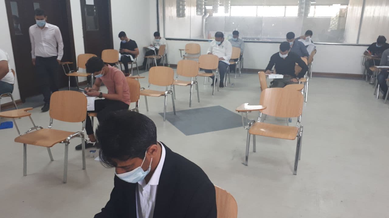 جانب من القاعات الامتحانية لقسم التكييف والتبريد في جامعه وارث الأنبياء ليوم الثلاثاء المصادف ٦ / ٤ / ٢٠٢١ والذي يعكس صوره مثاليه لتطبيق التباعد الاجتماعي والالتزام بارتداء الكمامات تنفيذا لقرارات خلية الأزمة لمنع تفشي فيروس كورونا.