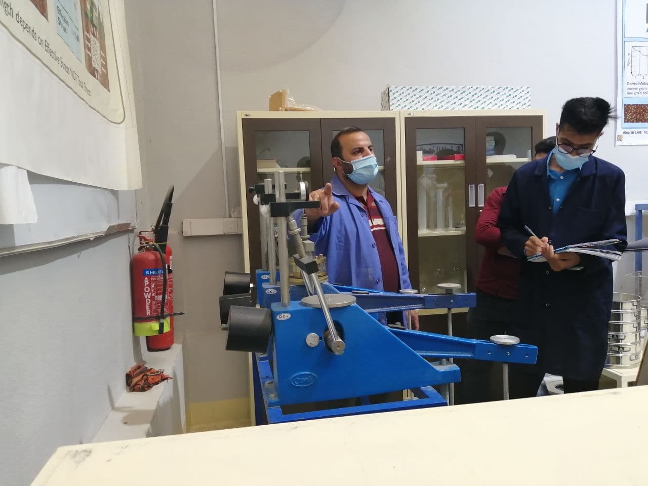 جانب من المحاضرة العملية لطلبة قسم الهندسة المدنية في مختبر التربة (فحص الانضمام للتربة)
