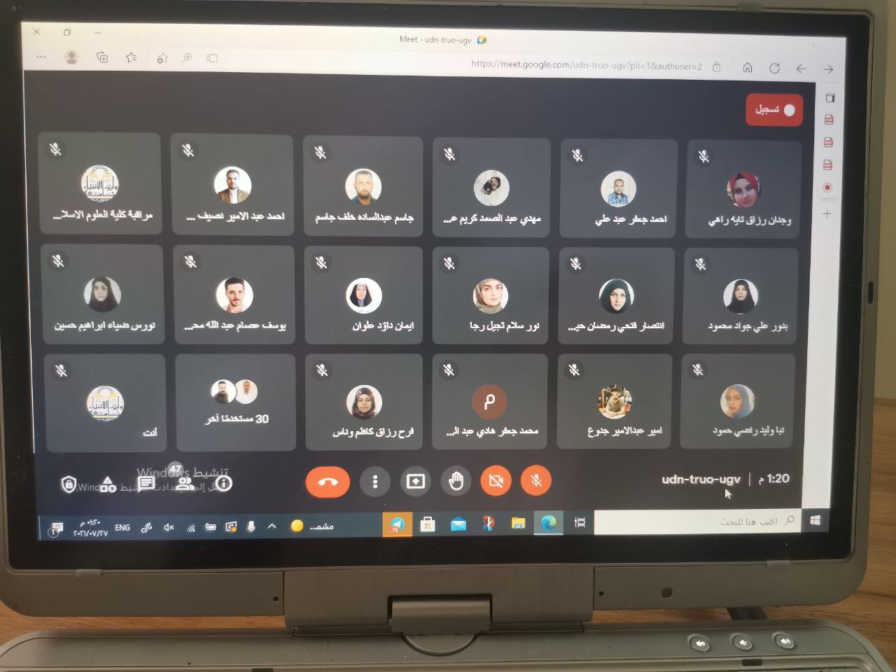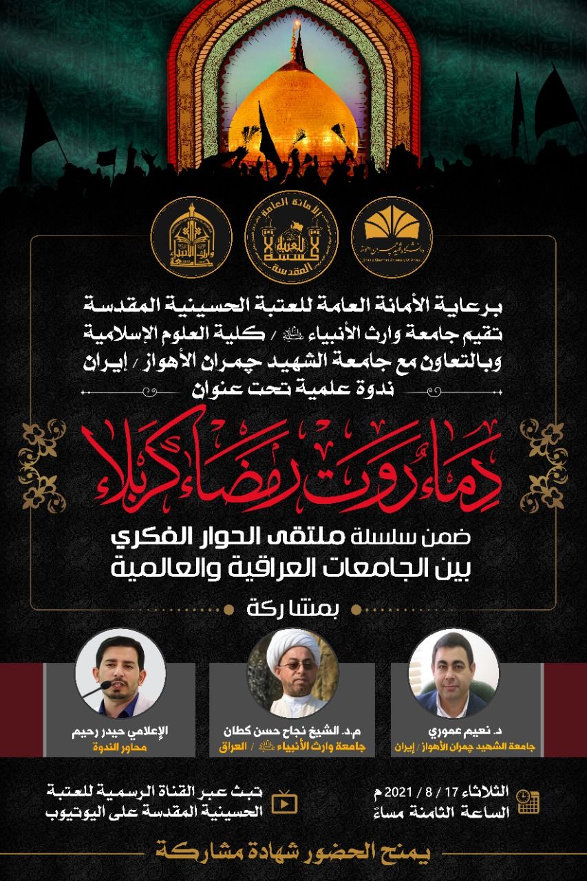 ندوة علمية بعنوان ( شبهات حول القرآن الكريم) يلقيها الدكتور نجاح حسين الحسناوي وبادارة م. م. ياسمين سلمان الطرفي في تمام الساعة الثامنة والنصف مساء من يوم السبت الموافق ٧ / ٨ /٢٠٢١ عبر منصة التعليم الإلكتروني الكوكل ميت