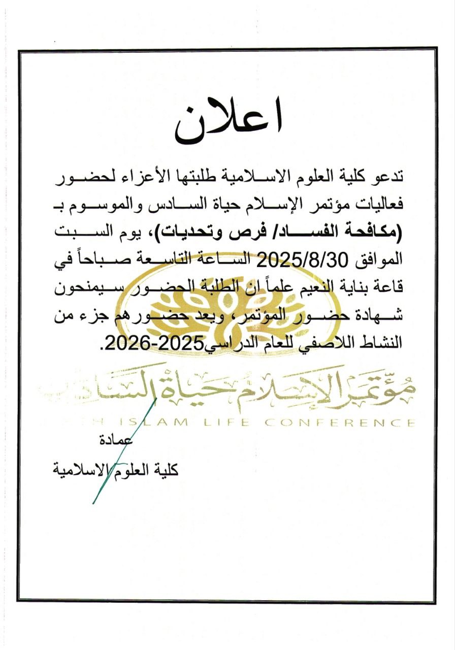 تدعو كلية العلوم الإسلامية طلبتها الأعزاء لحضور فعاليات مؤتمر "الإسلام حياة" السادس الموسوم بـ مكافحة الفساد / فرص وتحديات، وذلك يوم السبت الموافق 30\8\2025 ، في تمام الساعة التاسعة صباحًا، على قاعة بناية النعيم.