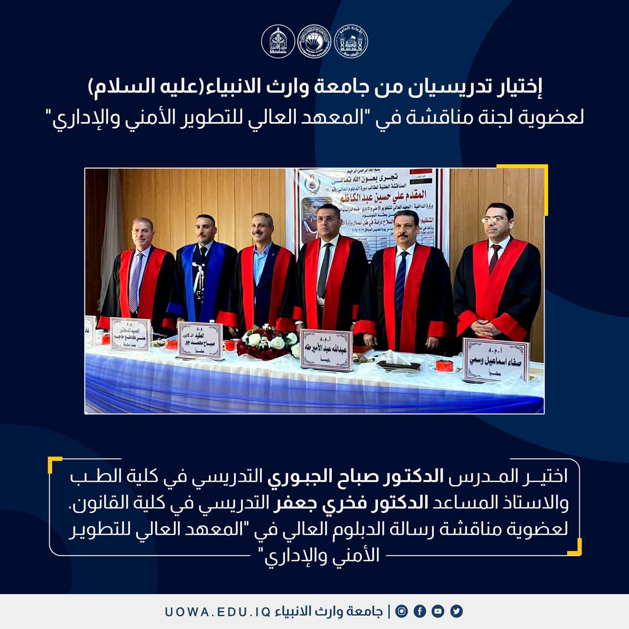 اختير الاستاذ المساعد الدكتور فخري جعفر التدريسي في كلية القانون، والمدرس الدكتور صباح الجبوري التدريسي في كلية الطب.لعضوية مناقشة رسالة الدبلوم العالي في "المعهد العالي للتطوير الأمني والإداري" يذكر ان العديد من السادة التدريسيين والعمداء في جامعة وارث الانبياء(عليه السلام) يتم اختيارهم كرئيس او عضو في لجان مناقشة اطروحات الدراسات العليا لكفائتهم العلمية