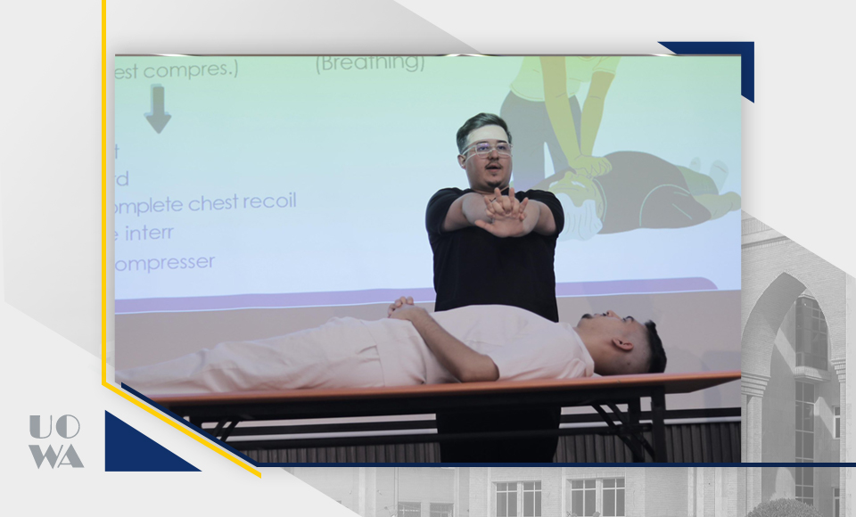 قدّم الطالب محمد علي الموسوي من كلية الطب مرحلة سادسة في جامعة وارث الأنبياء (عليه السلام) ورشة تدريبية في الإسعافات الأولية (BLS) لمجموعة من طلبة الكليات الطبية المختلفة، وذلك بدعوة من وزارة الشباب والرياضة- دائرة الرعاية العلمية، وبحضور وكيل وزير الشباب والرياضة.