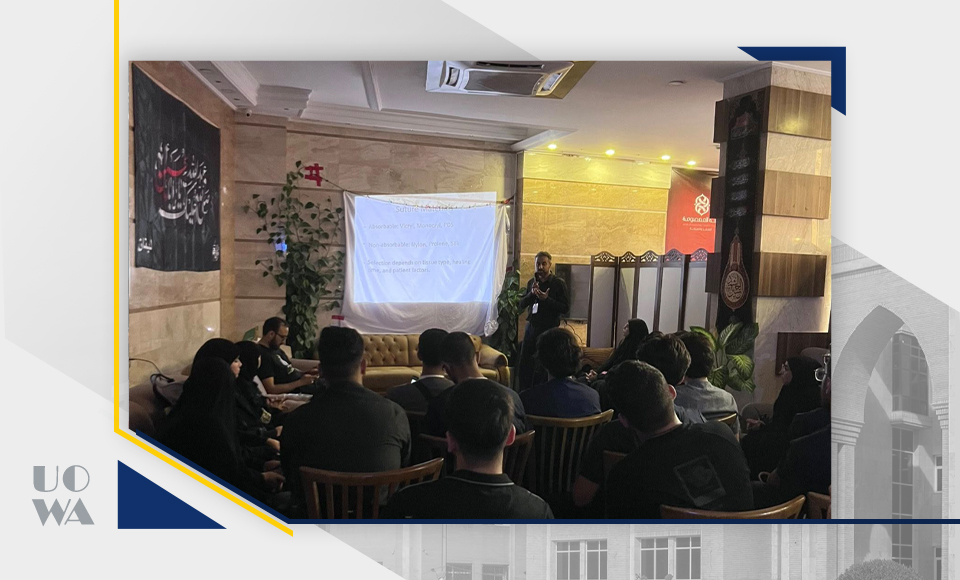 في اجواء العطاء والخدمة و بما يضمن جاهزيتهم لتقديم أفضل الخدمات الطبية في الميدان في زيارة اربعينية الامام الحسين عليه السلام جانب من سلسلة الورش التدريبية لطلبة كلية الطب في جامعة وارث الأنبياء التي نظمتها منظمة الإمامية العالمية IMI ورشة عملية بعنوان Suturing Skills قدّمها الدكتور Mudussar من الولايات المتحدة الأمريكية.