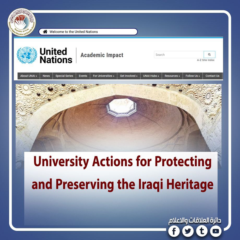 تأكيدا للتكامل العالمي الهادف وعملا بالمهام التي تضطلع بها الجامعات العراقية في الحفاظ على البيئة الثقافية والحضارية للعراق ولاسيما الجامعات التي حصلت على عضوية برنامج الأثر الأكاديمي للأمم المتحدة (The United Nations Academic Impact UNAI) فإن موقع المنظمة الدولية (https://www.un.org/.../university-actions-protecting-and...) يشيد بإجراءات الجامعة التكنولوجية لحماية التراث العراقي والحفاظ عليه من خلال أخذ زمام المبادرة بتأسيس أول وحدة لتكنولوجيا الحفظ التاريخي التزاما بأجندة وأهداف التنمية المستدامة وتصميم برنامج للدراسات العليا ضمن مجال الهندسة المعمارية وتنفيذ مشروع (UOT Virtual Museum) لحفظ التراث العراقي وتوثيقه رقميا.