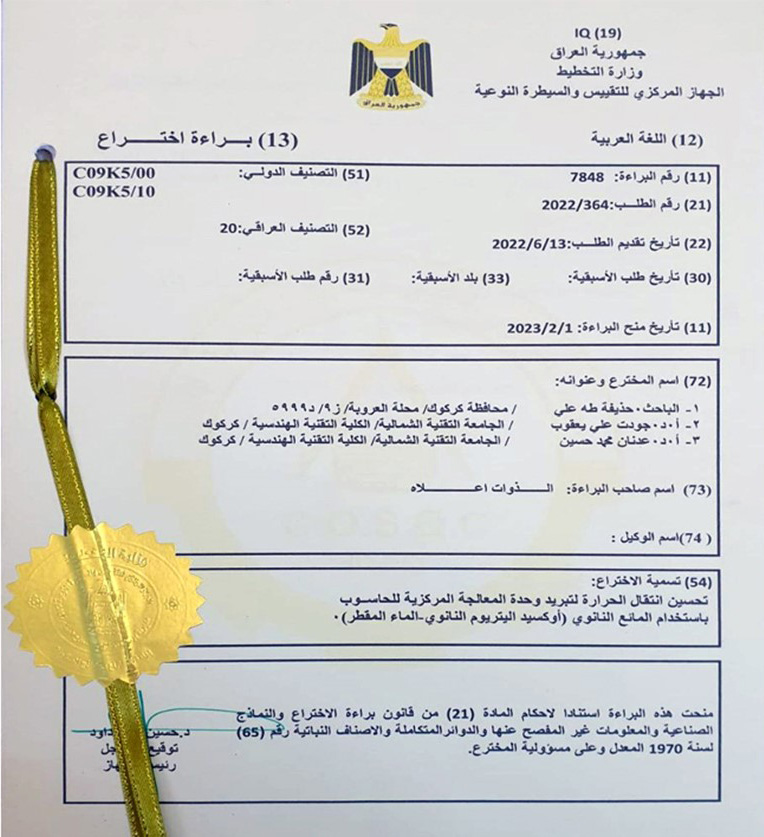براءة اختراع مشتركة في الجامعة التقنية الشمالية عن تحسين انتقال الحرارة لتبريد وحدة المعالجة المركزية للحاسوب باستخدام المانع النانوي (اوكسيد اليترويوم النانوي - الماء المقطر)
