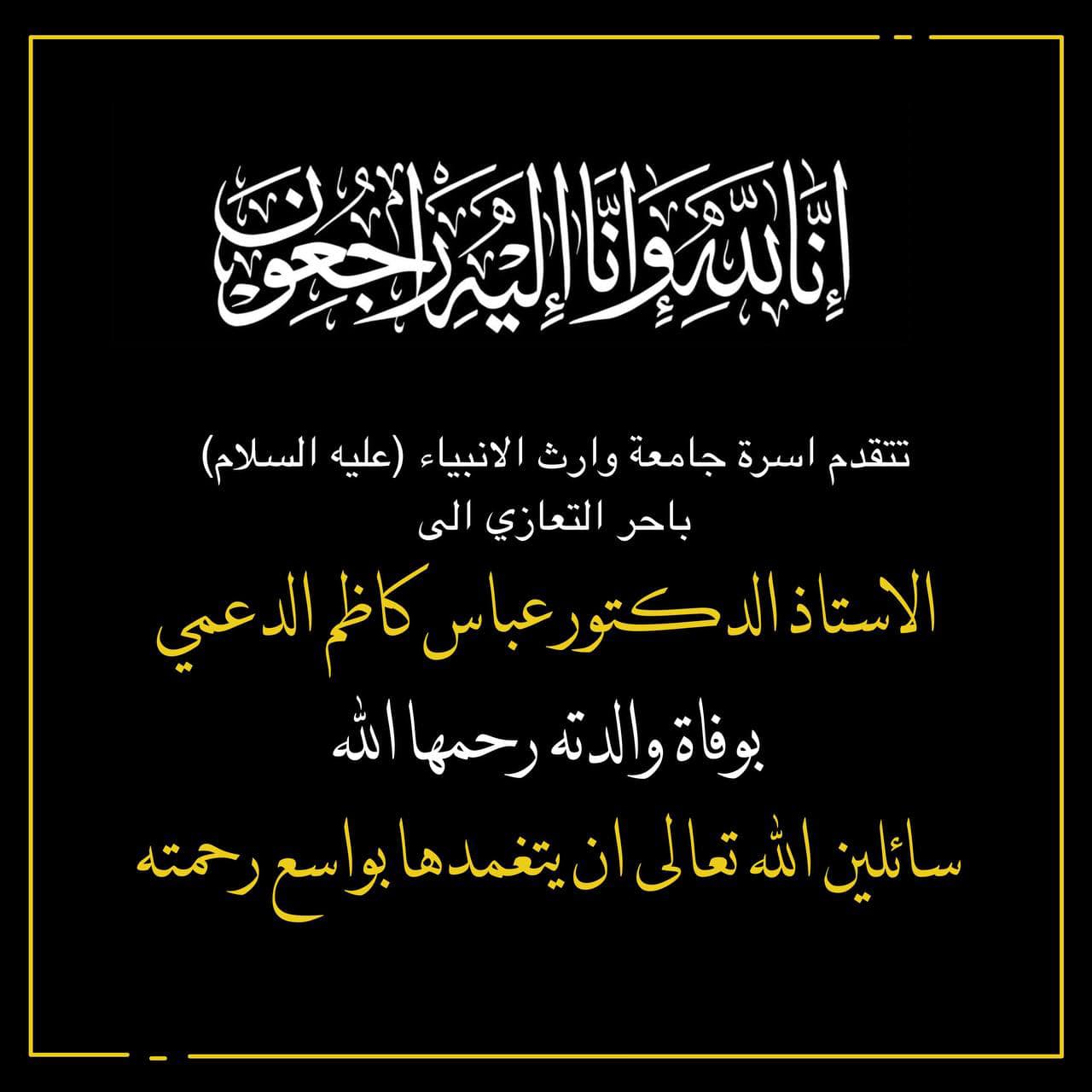 تتقدم جامعة وراث الأنبياء (عليه السلام) بالتعزية والمواساة الى الدكتورة نضال المالكي لوفاة والدتها سائلين الله أن يتغمدها بوافر رحمته إنه سميع مجيب