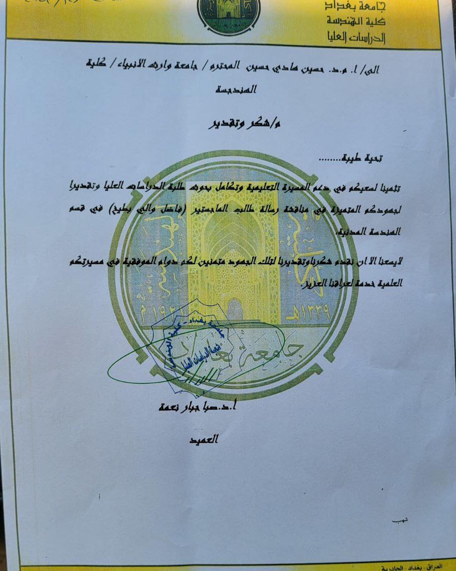 اختير الأستاذ المساعد الدكتور حسين هادي معاون عميد كلية الهندسة عضوا لمناقشة رسالة ماجستير لاحد طلبة الدراسات العليا في كلية الهندسة /قسم الهندسة المدنية بجامعة بغداد،ومن جانبها قدمت عمادة كلية الهندسة في جامعة بغداد كتاب شكر وتقدير للدكتور حسين هادي تثميناً لجهوده وسعيه في دعم العملية التعليمة وتكاملاً لبحوث طلبة الدراسات العليا.يذكر أن العديد من السادة العمداء والتدريسيين في جامعة وارث الأنبياء(عليه السلام) يتم اختيارهم كرئيس أو عضو في لجان مناقشة اطروحات الدراسات العليا لكفاءتهم العلمية .