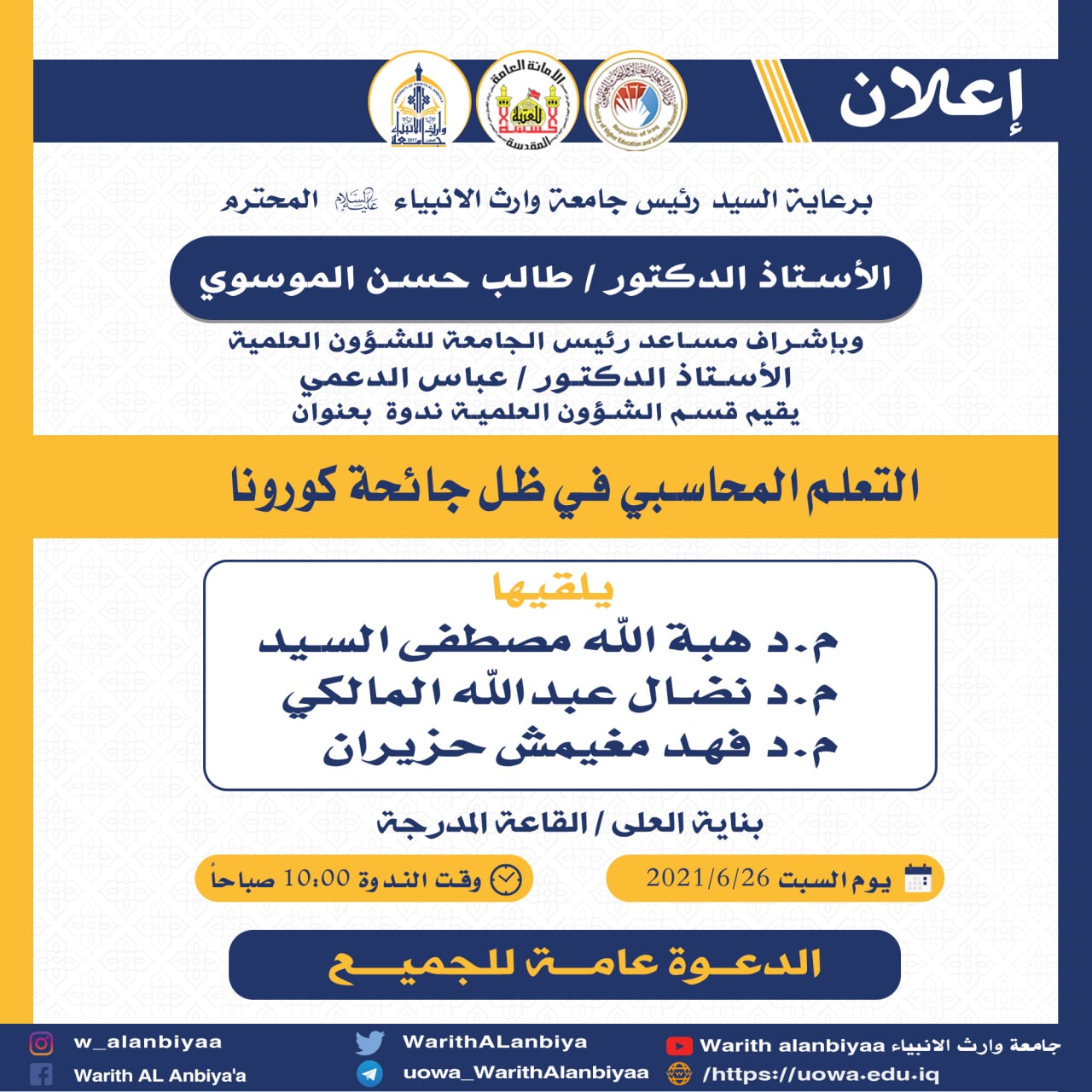 يطل علينا هذا الاسبوع الدكتور مصطفى الابراهيمي ليتحفنا بمعلومات قيمة عن كيفية الشروع في البحث العلمي في محاضرة بعنوان ( خطوات البحث العلمي ) وستكون يوم الخميس المصادف ٢٤/٦/٢٠٢١ في تمام الساعة التاسعة مساء راجين من اعزائنا الطلبة الحضور والاستفادة من المحاضرة