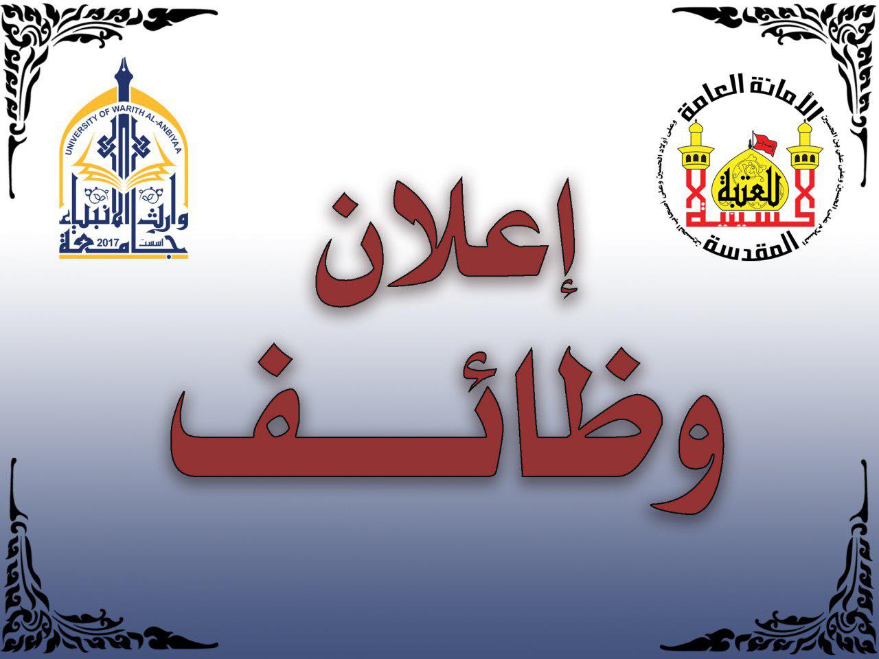 تعلن جامعة وارث الانبياء(عليه السلام) التابعة لقسم التعليم العالي في العتبة الحسينية المقدسة عن توفر درجات وظيفية (عدد ٣) لحملة شهادة (البكلوريوس او الماجستير ) للعمل في اقسام الجامعة التالية على ان يكون المتقدم من سكنة محافظة كربلاء المقدسة حصرا: ١-مركز التعليم المستمر(عددالدرجات الوظيفية ٢) أ-يشترط بالمتقدم ان يكون حاصل على شهادة البكلوريوس او الماجستير في علوم الحاسبات او هندسة الحاسباتب-يجيد مهارة تحدث وكتابة وقراءة اللغة الإنكليزية بصورة جيدة ج-يمتلك اساسيات التواصل مع المجلات العالمية د-يمتلك خبرة في ادارة التعليم الإلكترونيهـ-قادر على تصميم المواقع الإلكترونية.
