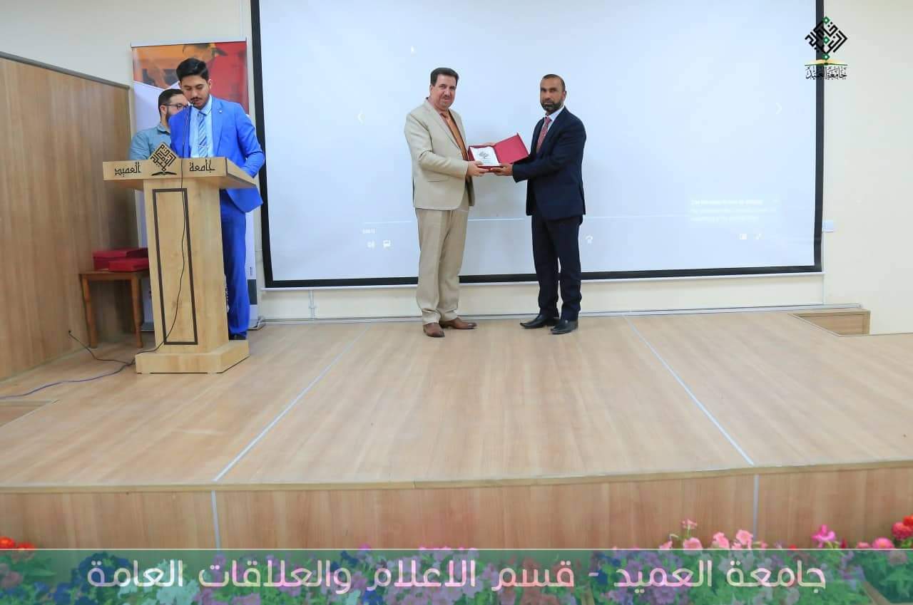 وفي الختام تم تكريم الاستاذ المحاضر بتوجية كتاب شكر وتقدير من قبل مركز التعليم المستمر على يد أ.م.د.خميس بندر عبيد / عميد كلية التمريض.