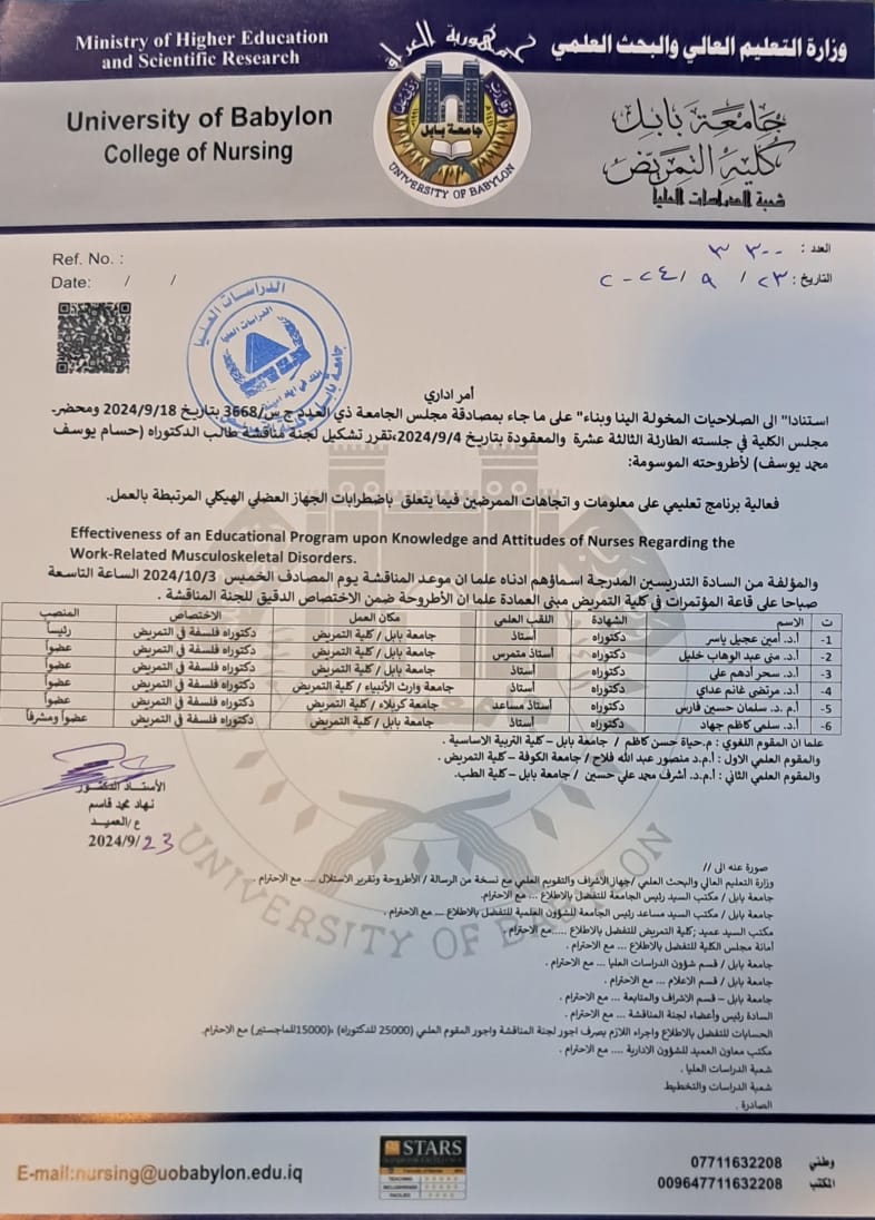 شاركت عميد كلية العلوم بعضوية اللجان لمناقشة اطروحة دكتوراه