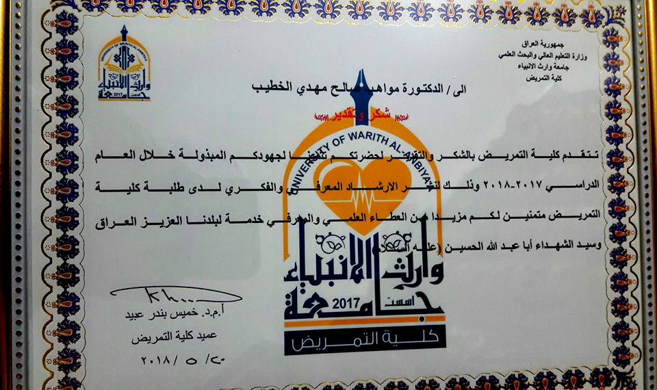 كلية التمريض تتقدم بالشكر والتقدير الى الدكتوره مواهب الخطيب