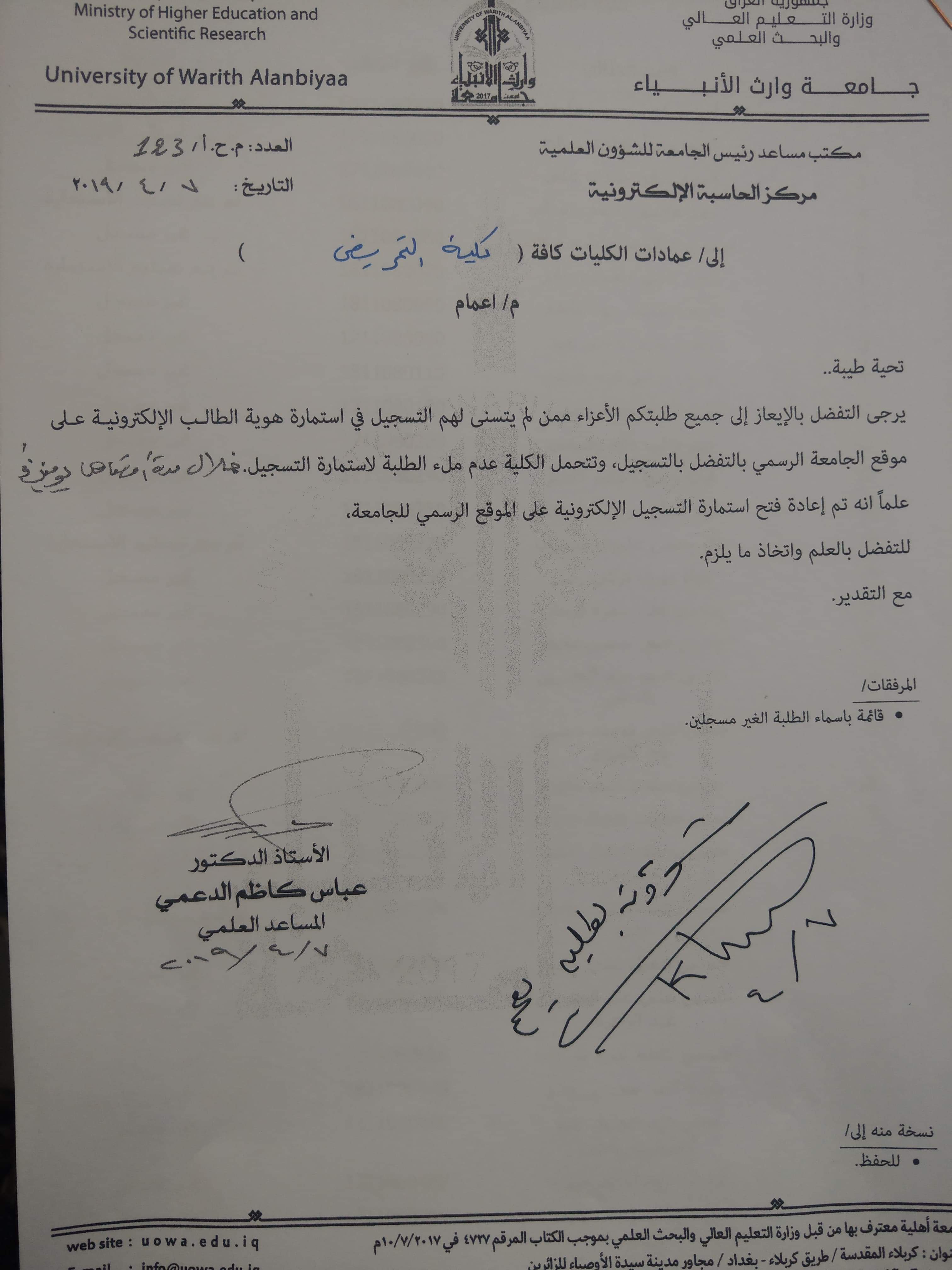 على الطلبة المدرجة اسمائهم بالقوائم الاسراع في اكمال استمارة الهوية علما ان الموقع تم اعادة فتحة لاجل السماح لهم باكمال استماراتهم وتعتبر اخر فرصة للطلبة لاكمال الهوية.