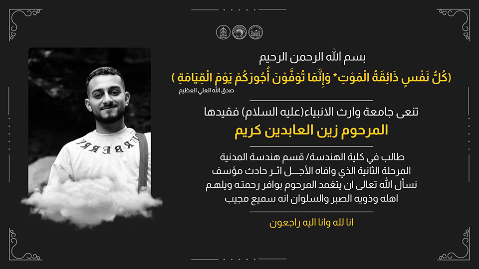 (زين العابدين كريم) الطالب في قسم الهندسة المدنية / المرحلة الثاني، الذي وافاه الأجل إثر حادث مؤسف، نسأل الله تعالى ان يتغمد المرحوم بوافر رحمته ويلهم أهله وذويه الصبر والسلوان انه سميع مجيب.