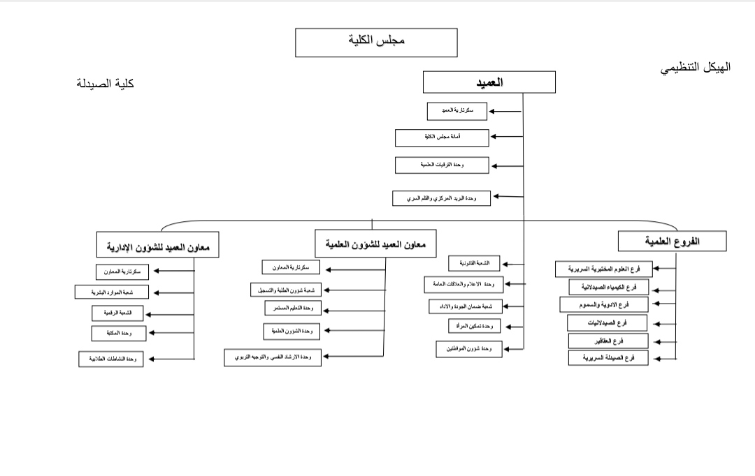 في خطوة تهدف إلى تعزيز العمل المؤسسي أقر مجلس كلية الصيدلة خلال اجتماعه الافتتاحي الهيكل التنظيمي للكلية، بما يضمن توزيع المهام والمسؤوليات بكفاءة وفاعلية  علما ان الكلية حصلت علئ مصادقة السيد رئيس الجامعة.