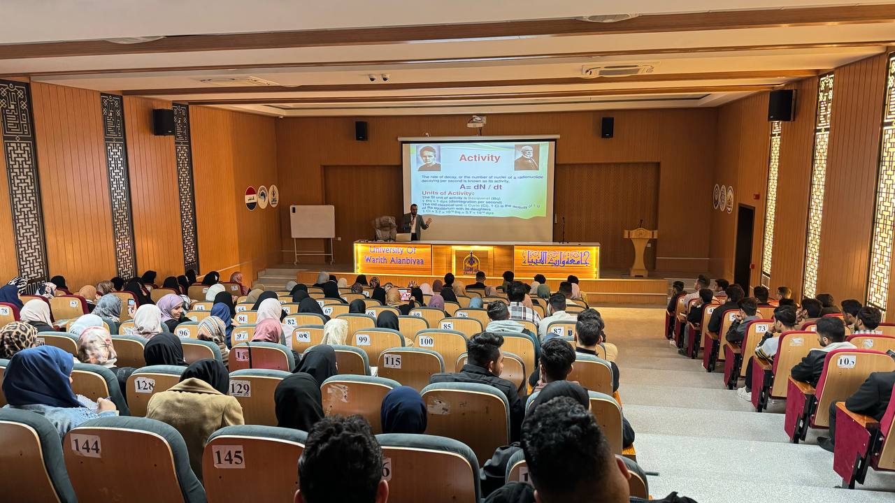 اقامت كلية العلوم في جامعة وارث الانبياء (عليه السلام) ورشة بعنوان "الكميات والوحدات الإشعاعية" قدمها الدكتور احمد موسى لطلبة الفيزياء الطبية بهدف شرح قياس الاشعاع وكيفية السيطرة عليه والحماية منه وكيفية استخدامه في اتطبيقات الصناعية والطبية.