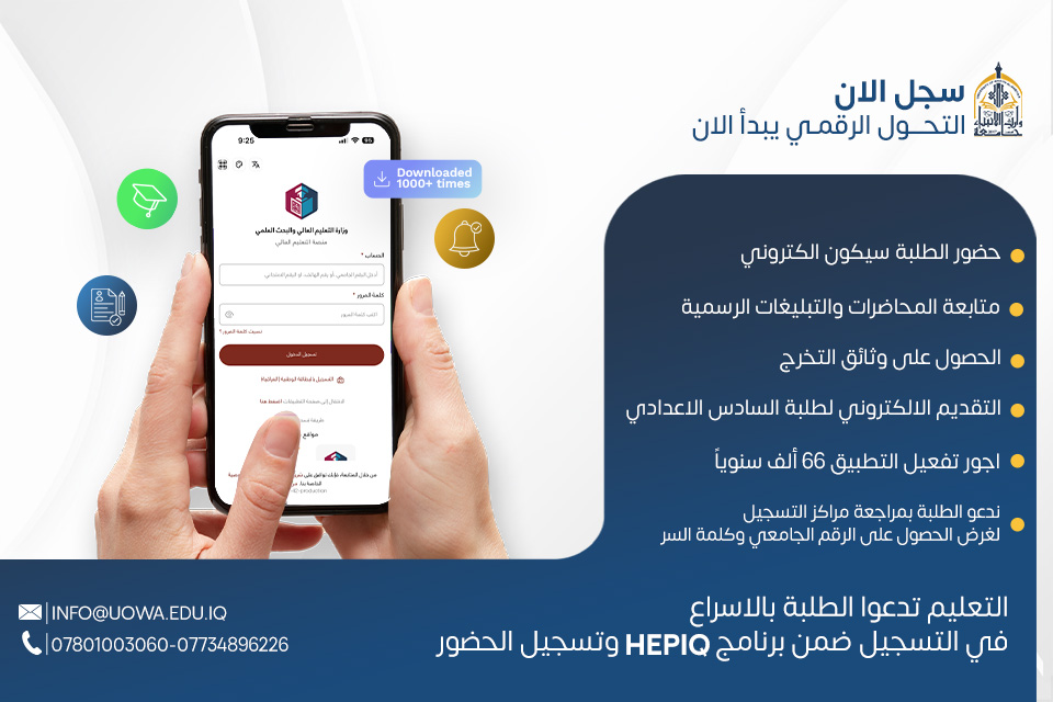 تدعو وزارة التعليم العالي والبحث العلمي طلبتنا الأعزاء إلى الإسراع في التسجيل ضمن برنامج HEPIQ وإكمال إجراءات تسجيل الحضور، وذلك لضمان استفادتهم من الخدمات والفرص الأكاديمية التي يوفرها البرنامج.