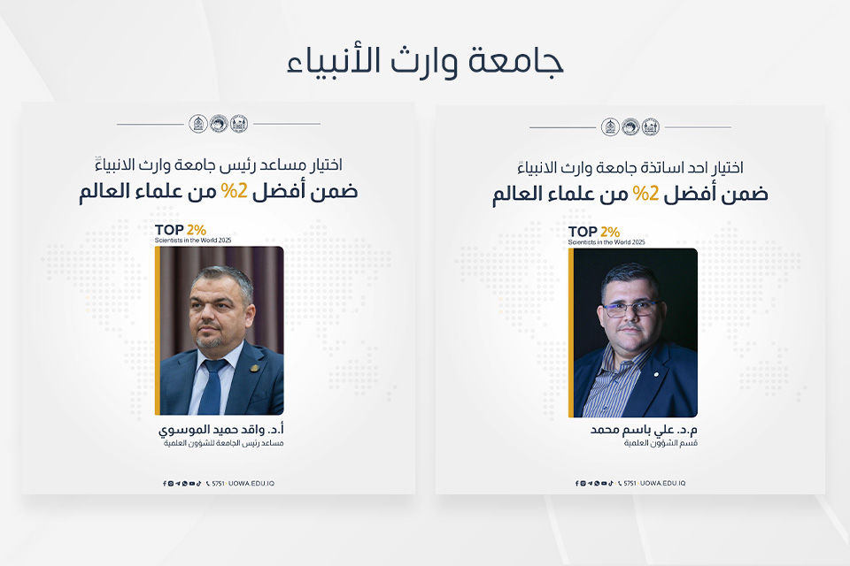 في إنجاز علمي جديد يضاف إلى سجل النجاحات الأكاديمية لجامعة وارث الأنبياء (عليه السلام)، أُدرج اسم مساعد رئيس الجامعة للشؤون العلمية الأستاذ الدكتور واقد حميد الموسوي، والمدرس الدكتور علي باسم ضمن قائمة أفضل 2% من علماء العالم لعام 2025، بحسب نتائج الدراسة السنوية التي أجراها فريق بحثي من جامعة ستانفورد الأمريكية.