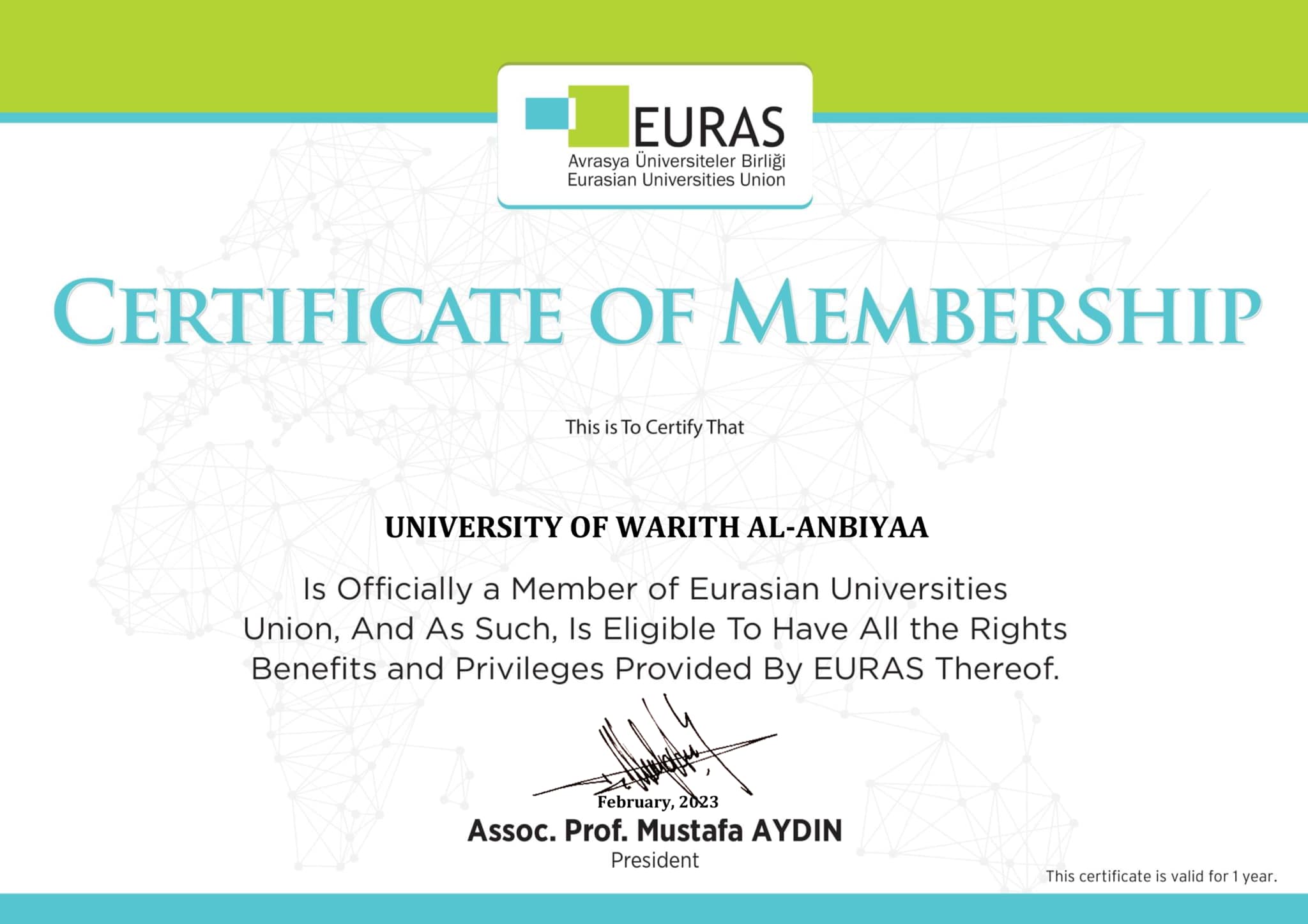 الموافقة على انضمام جامعة وارث في اتحاد الجامعات الاوربية الاسيوية EURAS