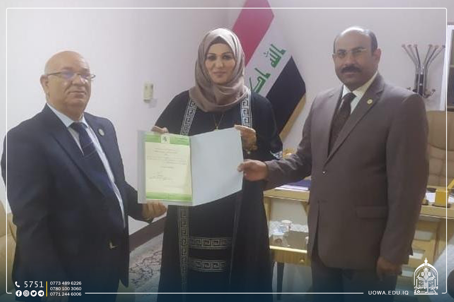 زار وفد من نقابة الأكاديميين العراقيين فرع كربلاء المقدسة برئاسة الاستاذ الدكتور منير عبد العالي الدعمي نقيب الأكاديمين في كربلاء جامعة وارث الانبياء(عليه السلام)، لتقديم التهاني والتبريكات الى رئيسة قسم المحاسبة الاستاذ المساعد الدكتورة هبة الله مصطفى والاستاذ المساعد الدكتورة نضال المالكي، بمناسبة ترقيتهم الى مرتبة (استاذ المساعد)، داعين لهم بالتوفيق خدمةً للمسيرة العلمية في بلدنا العزيز .