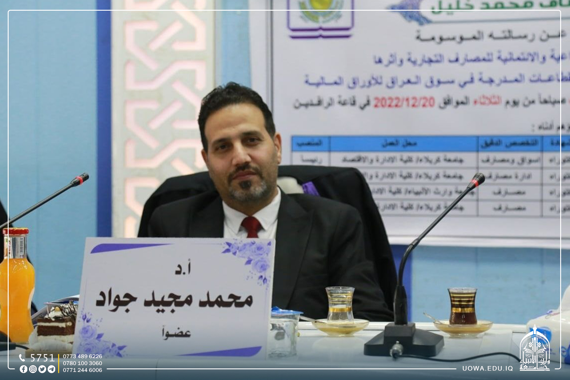 اختير الدكتور محمد مجيد جواد رئيس قسم ادارة الاعمال في كلية الادارة والاقتصاد عضوا لمناقشة رسالة ماجستير لاحد طلبة الدراسات العليا في جامعة كربلاء /كلية الادارة والاقتصاد،