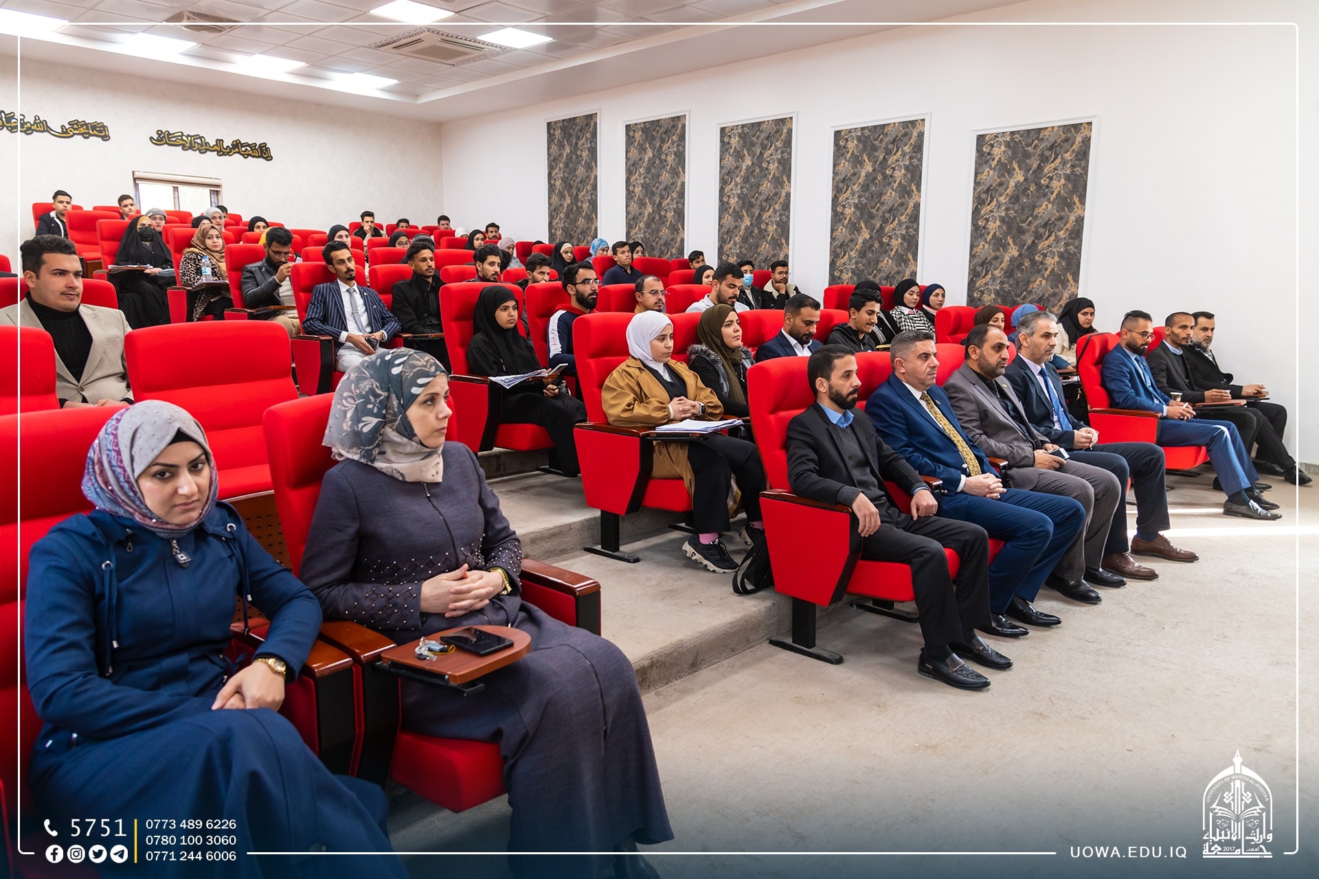 جانب مصور من الجلسة المسائية "للمؤتمر الوطني الاول" الذي اقامته جامعة وارث الانبياء(عليه السلام)/ كلية العلوم الإسلامية، وبالتعاون مع قسم تطوير الموارد البشرية" والذي تضمن ٥٣ بحث علمي فازت منها خمسة بحوث، وتم تكريمهم بدرع التميز اما بقية البحوث فتم تكريمهم بجوائز أخرى.