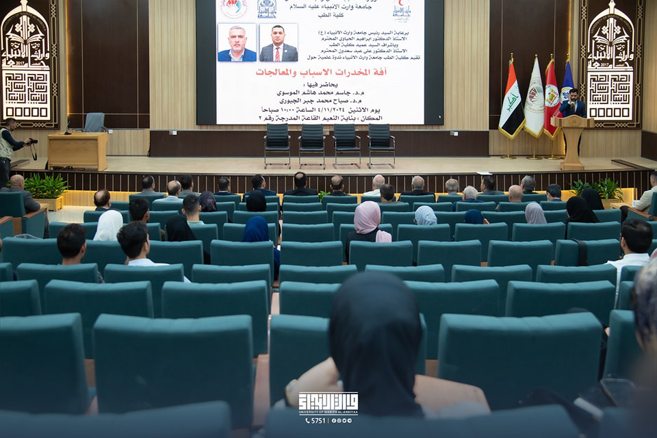 The College of Medicine at the University of Warith Al-Anbiyaa (PBUH) held a scientific seminar titled "The Plague of Drugs: Causes and Solutions," presented by Dr. Jassim Al-Mousawi and Dr. Sabah Al-Jubouri. The seminar explored the reasons behind youth drug abuse, including social and economic pressures and environmental influences. It also discussed possible solutions to curb the spread of this issue through prevention programmes and specialised treatment.