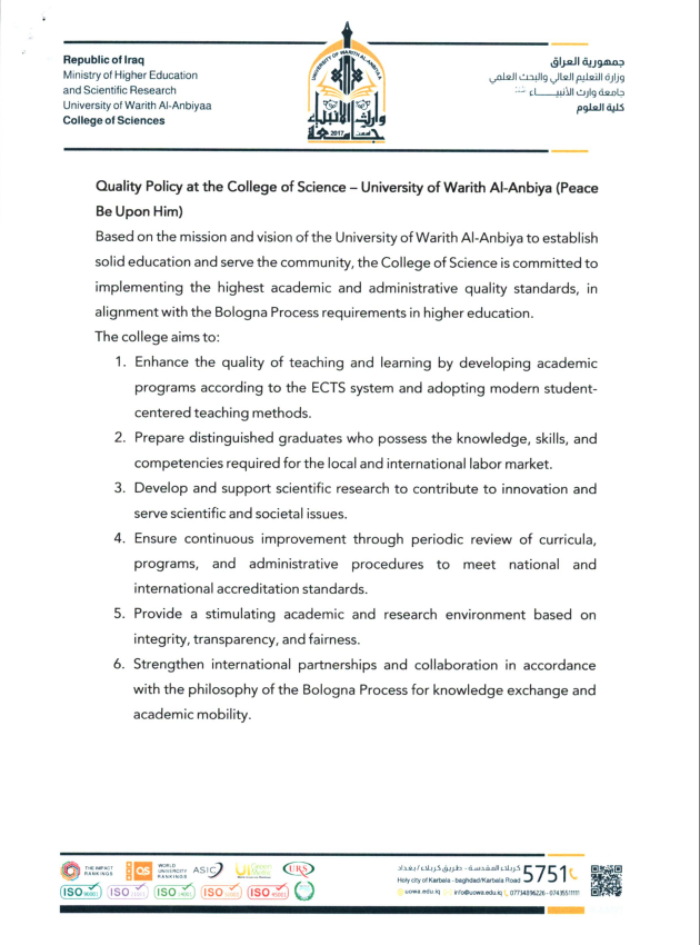 In alignment with the mission and vision of the University of Warith Al-Anbiyaa to foster excellence in education and community service, the College of Science is dedicated to upholding the highest academic and administrative quality standards, consistent with the principles of the Bologna Process in higher education.