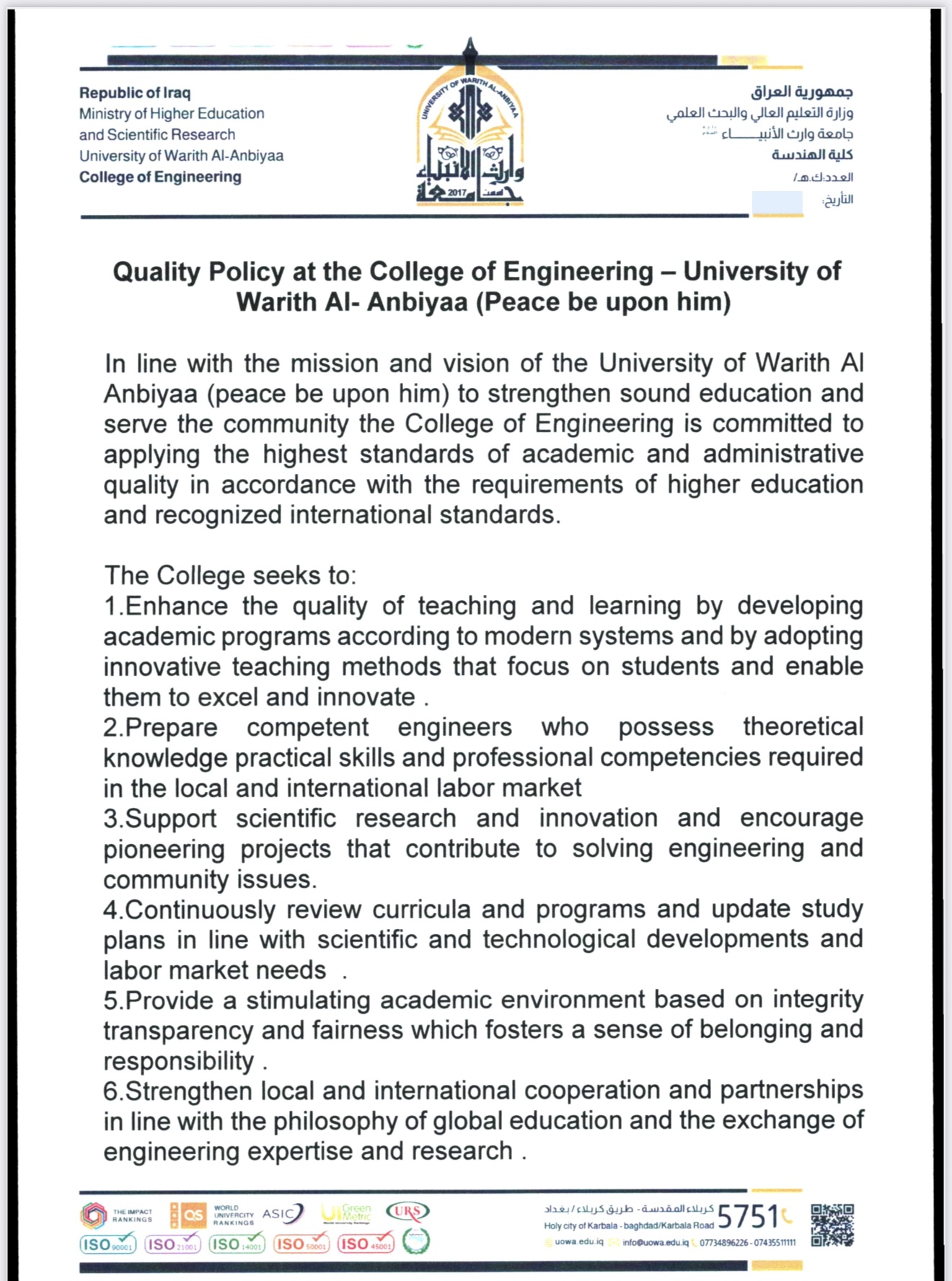 The University of Warith Al-Anbyaa is committed to and abides by the following: