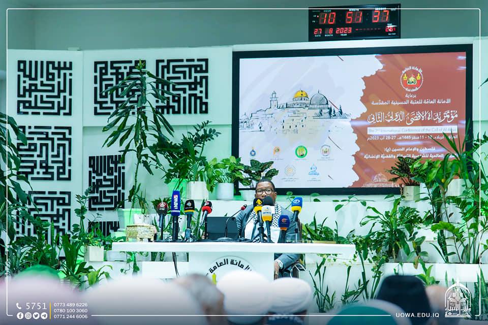 In the presence of the University President, Professor Dr. Ibrahim Al-Hayawi, the "Second International Al-Aqsa Call Conference" was inaugurated within the holy precinct of the Imam Hussein Shrine. The conference is organized by the Al-Aqsa Call Foundation and the Global Campaign to Return to Palestine, under the auspices of the General Secretariat of the Holy Shrine of Imam Hussein (Peace Be Upon Him).
