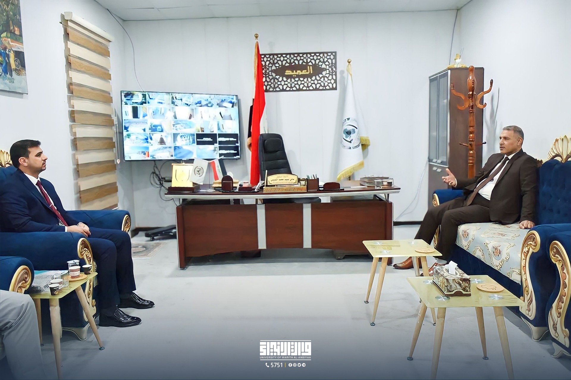 A delegation from the College of Management and Economics at the University of Warith Al-Anbiyaa (peace be upon him), led by the Assistant Dean, Dr. Fahad Mughaimish Al-Shammari, visited the College of Industrial Management for Oil and Gas at the University of Basra for Oil and Gas. The delegation was received by the Dean of the College, Dr. Sami Obeid Al-Tamimi.