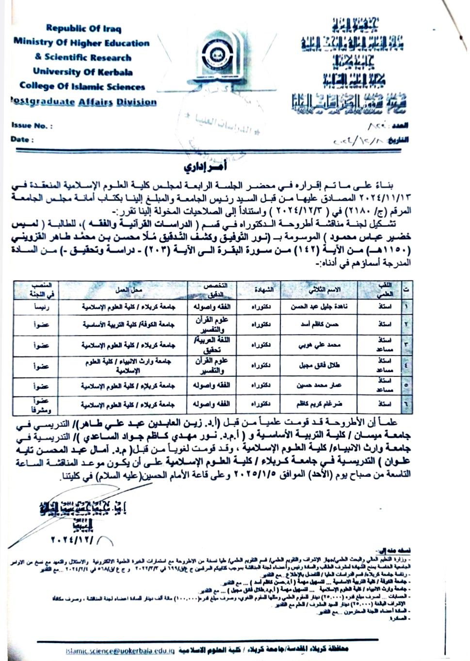 The Dean of the College of Islamic Sciences at the University of Warith Al-Anbiya, Dr. Talal Faeq Mujbil, participated in the discussion committee of the doctoral thesis of the student Lamis Khadir Abbas Mahmoud, which bore the title: