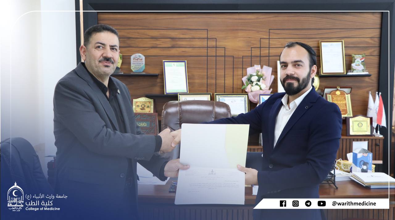 The process is followed-up by the presence of the Dean of the Faculty of Medicine at the University of Warith Al-Anbiyaa (PBUH), the esteemed Professor Dr. Ali Abd Saadoun Al-Ghazi, the esteemed Scientific Assistant, Professor Dr. Ali Mansour, and the esteemed Administrative Assistant, Professor Dr. Laith Al-Husseini.