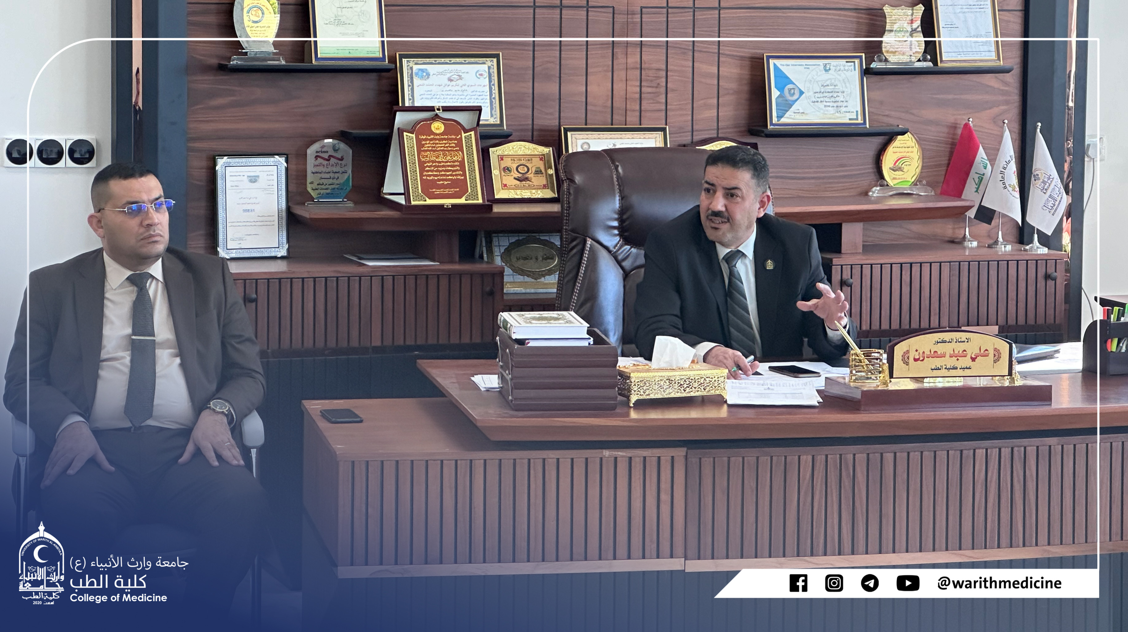 The Dean of the Faculty of Medicine at the University of Warith al-Anbiya (peace be upon him) received Professor Dr. Ali Abd Saadoun al-Ghazi, the respected Dr. Maad Nassif Jassim, a consultant to the British Royal College, where a presentation was made about the possibility of establishing a center for emergency and disaster medicine in cooperation with the British Royal College and opening channels of cooperation between the Royal British College and the University of Warith al-Anbiya. (A) Where the delegation was briefed on the infrastructure and human resources at the university.