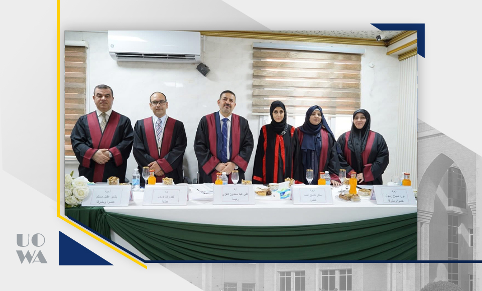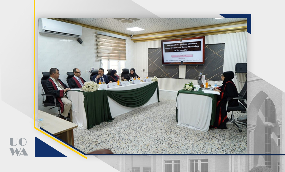Chaired by Professor Dr. Ali Abdul Saadoun, Dean of the College of Medicine at Warith al-Anbiya University, the discussion of the postgraduate diploma thesis, equivalent to a master's degree, was held at the College of Medicine at the University of Karbala. The thesis, titled "Evaluation of Emotional Difficulties among Women Having Had a Miscarriage in Karbala 2024," was held at the College of Medicine at the University of Karbala. The thesis was titled "Evaluation of Emotional Difficulties among Women Having Had a Miscarriage in Karbala 2024." The Dean participated in moderating the discussion session and praised the academic level and research efforts. He emphasized that these joint scientific collaborations between universities contribute to the exchange of expertise and the strengthening of the status of academic research. They are in line with the College of Medicine at Warith al-Anbiya University's approach to supporting sound research projects that address societal issues.
